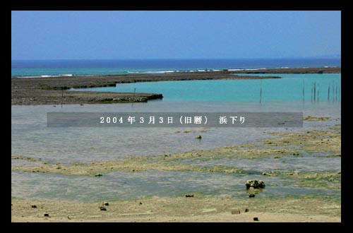 「浜下り」とは旧暦の3月3日に女性が海へ入り 手足を潮に浸して不浄を清め、健康を祈願する行事です。 今日では旧暦の3月3日前後に浜へ下り 潮干狩りを楽しむことが多くなっているようです。 |