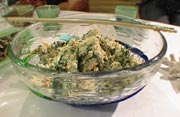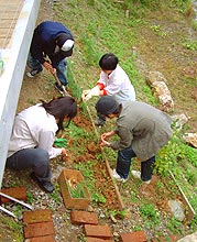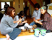 当日、お昼過ぎから人が集まり始めました。 デッキの下を流れる幸地川周辺のゴミ拾いから、 料理に使うクレソン採りや島ラッキョウ掘り、 竹の箸づくり、会場のセット、飾りの花摘みなど。 参加したそれぞれがいろいろな場所で好きな作業を していました。 互いに初めて顔を合わせる人も多かったのですが 自然に笑い声が聞こえてきます。 |
