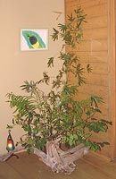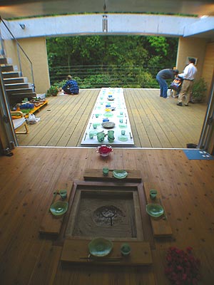 会場セッティングも完成。森からの流れてくる風を思わせるようなセッティング。 階段には瓦に貼られたメニュー表。採ってきたイッペイもブーゲンビリアも所長の生けた緑も映えています。 さあ、もうすぐ食事会が始まります。 |