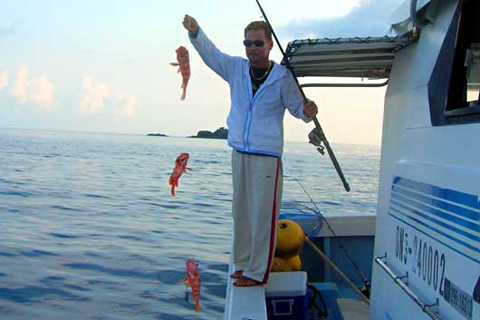 そろそろ終了という頃に、途中から竿を出した船長にヒット。なんと"チバナ”の三本掛け。