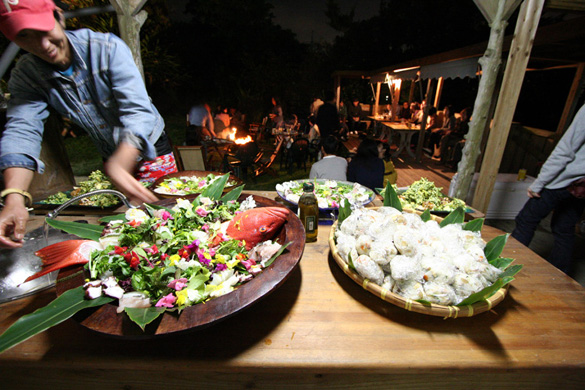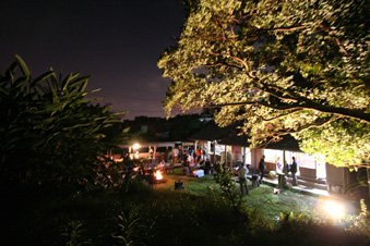 薪が焼べられ火が燃え上がる夕刻、お客様も集まりはじめました。 |